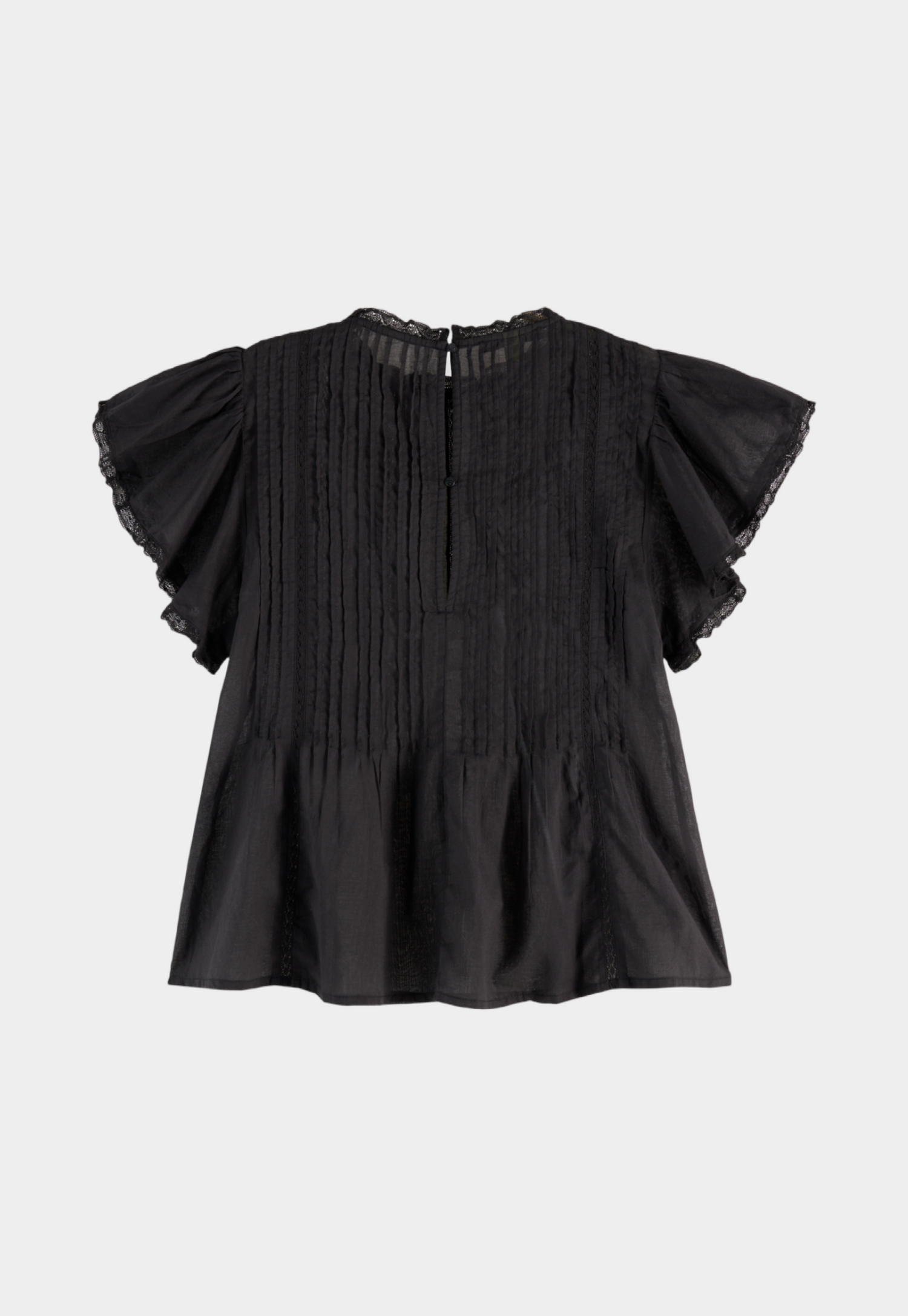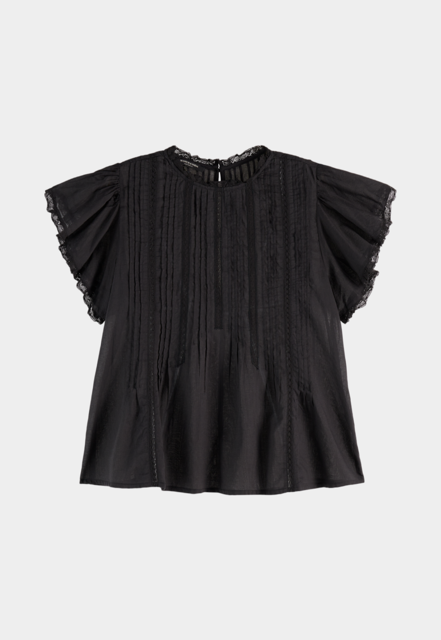 חולצה קצרה לנשים מבית המותג סקוצ' אנד סודה. בגזרה משוחררת, עם מפתח עגול, ושרוולים רחבים ומעט עומדים.